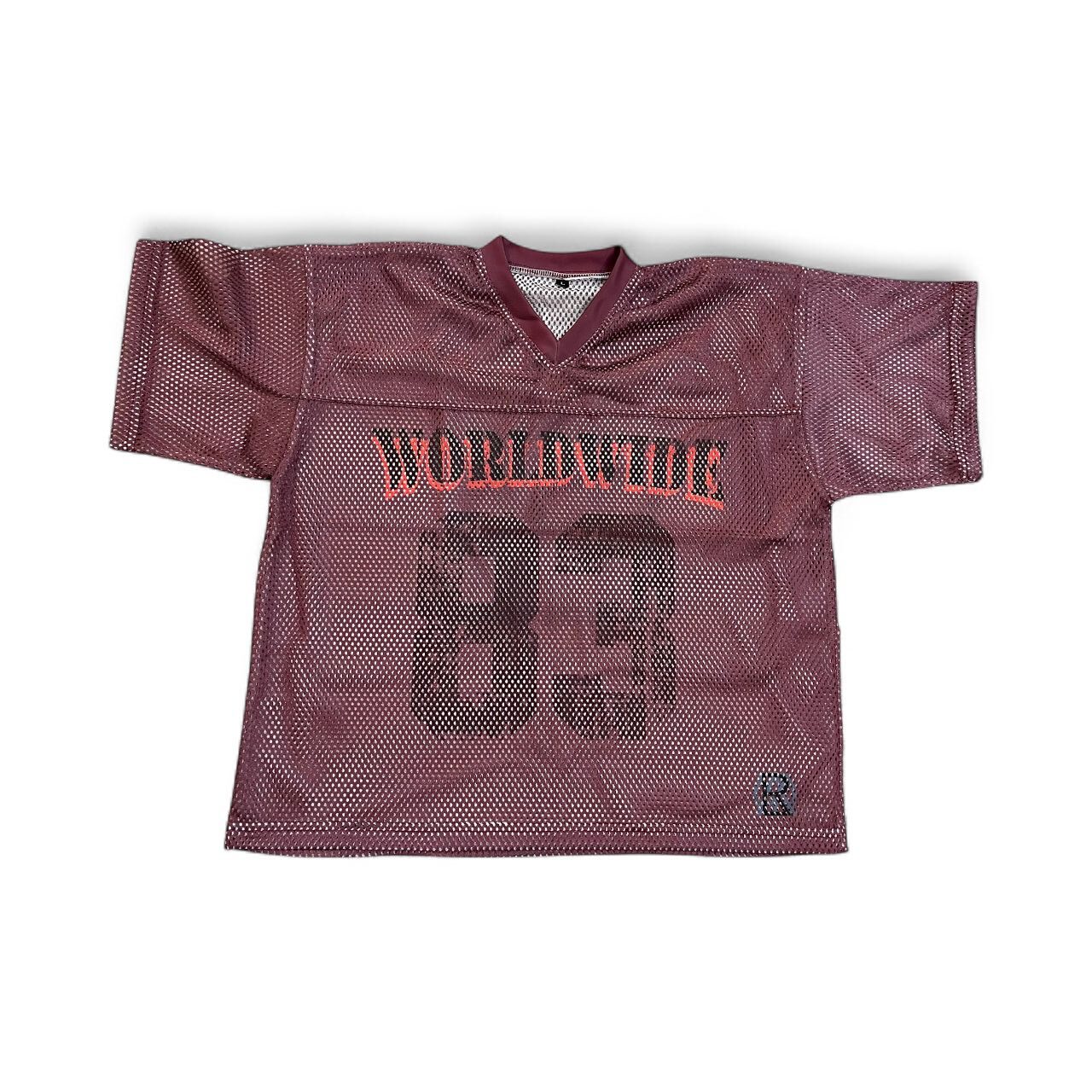 This jersey is cut in a relaxed, oversized football silhouette, crafted entirely from a breathable, high-quality mesh fabric in a rich Maroon/Burgundy hue. This provides an excellent layering piece for summer nights or a strong standalone look.