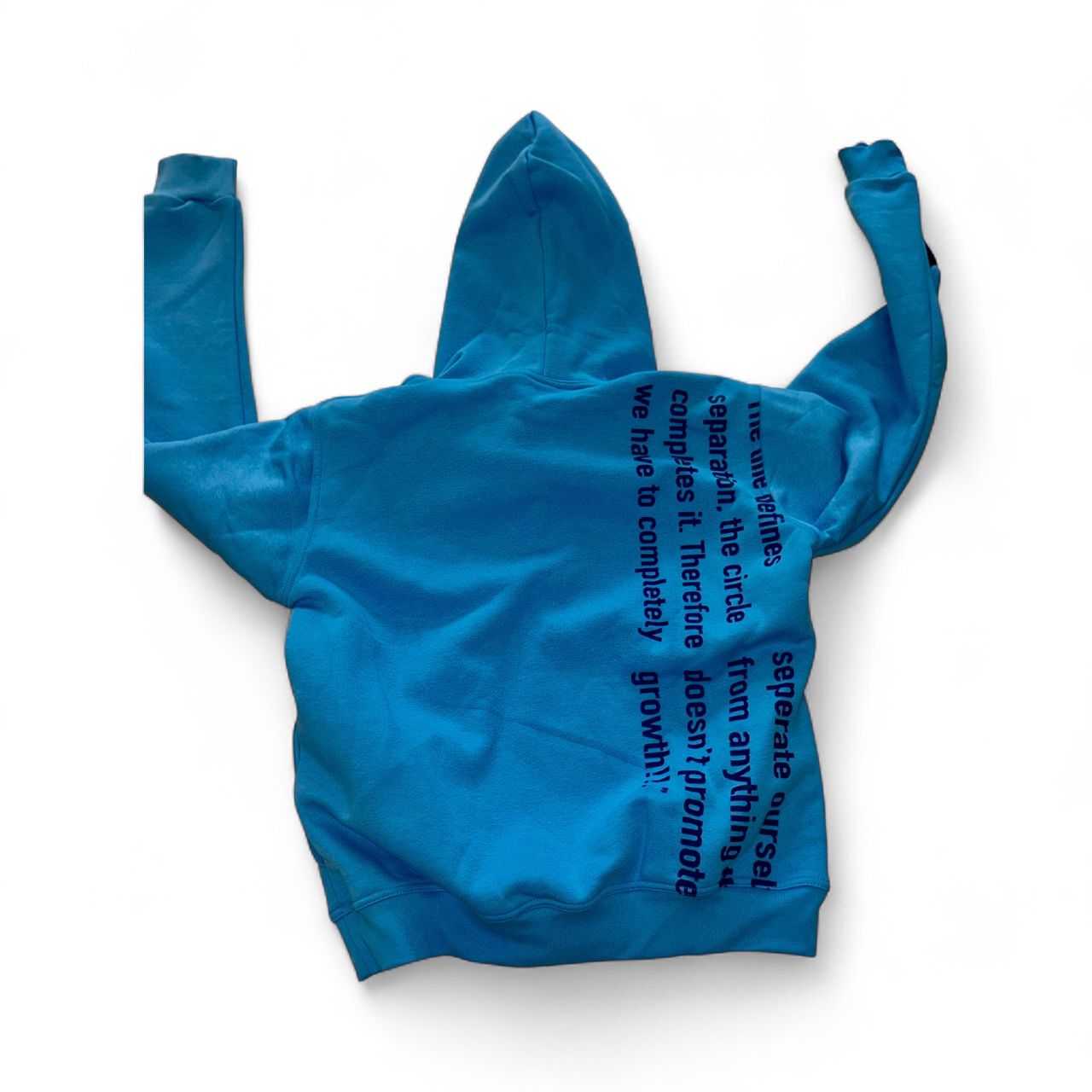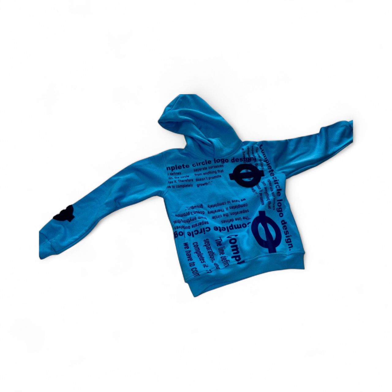 Step up your streetwear game with the bold and thought-provoking Complete Circle Hoodie. Crafted in a vibrant electric blue color, this hoodie features an all-over typographic design exploring the concept of completeness and growth. The standout design includes deep navy circle graphics and abstract printed text that wraps around the front and back, giving it a unique artistic touch. A smaller circle motif on the sleeve adds an extra layer of detail.