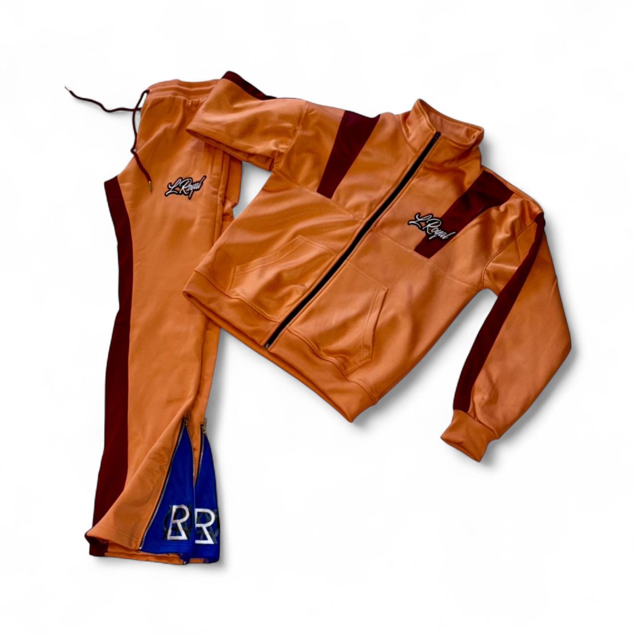 The suit features a warm burnt orange or peach base accented by sharp burgundy contrast panels down the sleeves, sides of the pants, and on the collar. The full-zip jacket includes convenient pockets and a crisp ‘L.Royal’ logo embroidered on the chest.