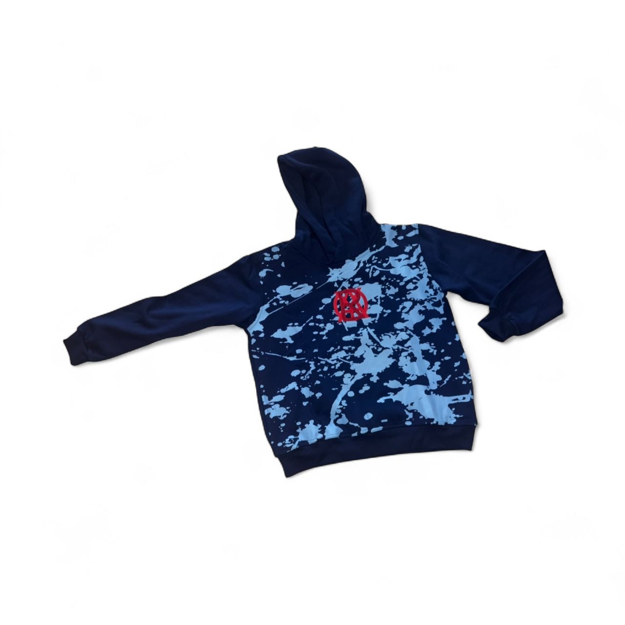 Make a statement without saying a word in the Splatter Hoodie. This distinctive pullover features a dynamic light blue paint splatter graphic over a deep navy base, ensuring you stand out from the crowd. The sleeves and hood are a solid navy for a balanced look. Finished with a bold, contrasting red embroidered logo on the chest, this hoodie offers a comfortable fit and unique street style.
