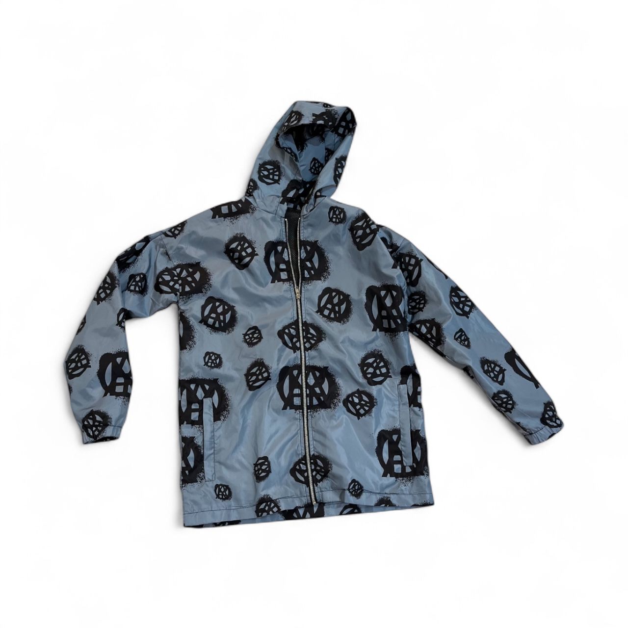 The jacket is crafted from a durable, light-as-air fabric in a cool, muted light blue/slate grey base color. It is completely covered in a bold, striking black all-over print featuring the distinctive L.Royal logo/motif in a dynamic, spray-paint-style pattern.